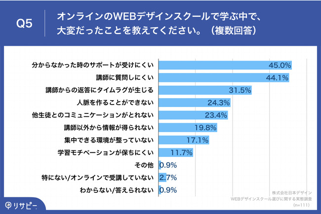 「Q5.オンラインのWEBデザインスクールで学ぶ中で、大変だったことを教えてください。(複数回答)」(n=111)と質問したところ、「分からなかった時のサポートが受けにくい」が45.0%、「講師に質問しにくい」が44.1%、「講師からの返答にタイムラグが生じる」が31.5%という回答となりました。