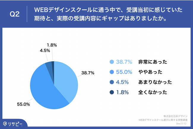 「Q2.WEBデザインスクールに通う中で、受講当初に感じていた期待と、実際の受講内容にギャップはありましたか。」(n=111)と質問したところ、「非常にあった」が38.7%、「ややあった」が55.0%という回答となりました。