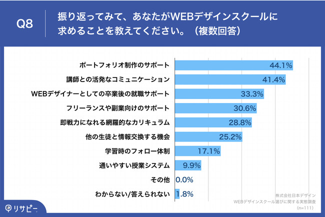 「Q8.振り返ってみて、あなたがWEBデザインスクールに求めることを教えてください。(複数回答)」(n=111)と質問したところ、「ポートフォリオ制作のサポート」が44.1%、「講師との活発なコミュニケーション」が41.4%、「WEBデザイナーとしての卒業後の就職サポート」が33.3%という回答となりました。