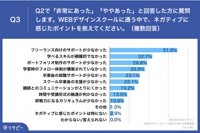 Q2で「非常にあった」「ややあった」と回答した方に、「Q3.WEBデザインスクールに通う中で、ネガティブに感じたポイントを教えてください。(複数回答)」(n=104)と質問したところ、「フリーランス向けのサポートが少なかった」が51.9%、「学べるスキルが網羅的でなかった」が32.7%、「ポートフォリオ制作のサポートが少なかった」が28.8%という回答となりました。