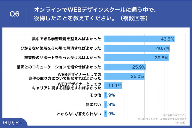 「Q6.オンラインでWEBデザインスクールに通う中で、後悔したことを教えてください。(複数回答)」(n=108)と質問したところ、「集中できる学習環境を整えればよかった」が43.5%、「分からない箇所をその場で解消すればよかった」が40.7%、「卒業後のサポートをもっと受ければよかった」が39.8%という回答となりました。
