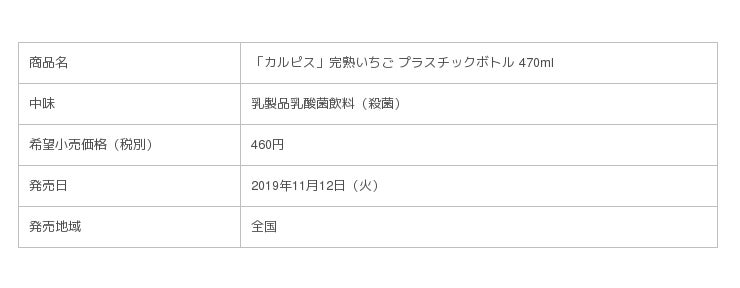 アサヒ飲料株式会社(本社 東京、社長 岸上 克彦)は、「カルピス」に完熟いちご果汁を加えた「『カルピス』完熟いちご」プラスチックボトル470mlを、11月12日(火)より2020年1月末までの期間限定で全国発売します。
