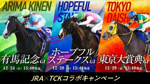 28 ホープフルステークス(GI)」、TCKで行われるダート競馬の総決算「12/29 東京大賞典(GI)」の3つのGIレースを楽しみながら豪華賞品が当たる、「有馬記念×ホープフルステークス×東京大賞典コラボキャンペーン」を実施します。