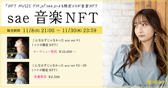 NFTマーケットのHEXA(ヘキサ)では、「NFT MUSIC FM」と「sae」による限定コラボ音楽NFTが11/8(火)21時から販売されます。