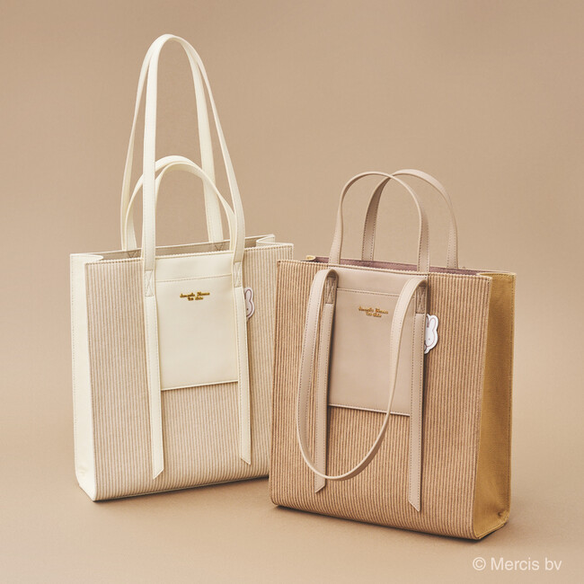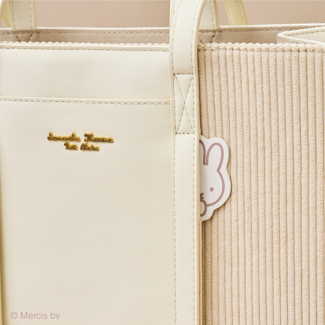 コーデュロイ生地を使用したトートバッグ。ハンドルのストラップ部分からミッフィーが覗いている可愛らしいデザイン。トレンドの縦型フォルム、A4対応のトートなのでデイリー使いにもピッタリ。