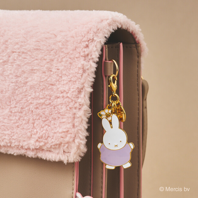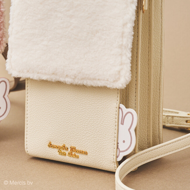 フラップ部分にボア素材をデザインしたスマホショルダーバッグはホワイト、ピンク&ブラウンのやさしい配色がポイント。シンプルなスタイリングとも相性抜群。サイドからひょっこりとのぞくミッフィーに、ついついきゅんとしてしまうこと間違いなし。