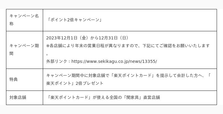 株式会社関家具(福岡県大川市、代表取締役社長:関 正、以下関家具)は、全国の直営店30店舗において、2023年12月1日(金)から、楽天ペイメント株式会社(以下:楽天ペイメント)が運用する共通ポイントサービス「楽天ポイントカード」の利用が可能になることをお知らせします。