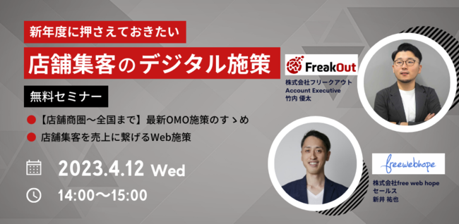 株式会社free web hope(本社:東京都中央区、代表取締役:相原ゆうき)は、無料のオンラインセミナー「新年度に押さえておきたい店舗集客のデジタル施策」を4月12日(水)に開催いたします。