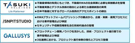 株式会社タスキホールディングス(本社:東京都港区、代表取締役社長:柏村 雄、以下:当社)は、ブロックチェーン領域における高い専門性を有し、スマートフォンで撮影した写真を使って楽しむ「Snap to Earn(撮って稼ぐ)」型の新感覚GameFiプラットフォーム「SNPIT」のパブリッシングを手掛けるSNPIT STUDIO FZCO(本社:Dubai(ドバイ), UAE、CEO:大塚 敏之、以下:SNPIT STUDIO)および、同サービスの開発を行う株式会社GALLUSYS(本社:東京都港区、代表取締役:浅井 俊光、以下:GALLUSYS)とともに、不動産RWA(※1)の社会実装に向けた共同実証実験(PoC)を開始することに、本日合意いたしました。