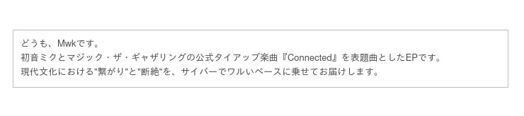 初音ミクとマジック・ザ・ギャザリングの公式タイアップ楽曲「Connected」をリードトラックとした6曲入りのEP。