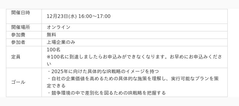 株式会社IR Roboticsは12月23日(月) 16:00より「IR」をテーマにウェビナーを開催いたします。IRに携わる全ての方へ向けて、日々のIR活動に活かせる機会を提供いたします。