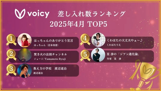 株式会社愛とーと(福岡県那珂川市)代表のはっちゃんこと岩本初恵氏のVoicyチャンネルが2025年4月度「差し入れランキング」で第1位を獲得しました。2024年10月度から7ヵ月連続の1位獲得です。