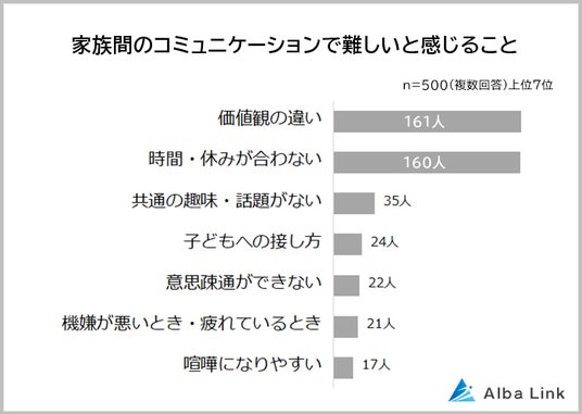 家族間のコミュニケーションで難しいと感じることを聞いたところ、1位「価値観の違い(161人)」、2位「時間・休みが合わない(160人)」が圧倒的に多くなりました。3位「共通の趣味・話題がない(35人)」、4位「子どもへの接し方(24人)」が続きます。