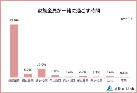 「家族全員が一緒に過ごす時間」を聞いたところ、「ほぼ毎日」と答えた人がもっとも多く、73.0%となっています。