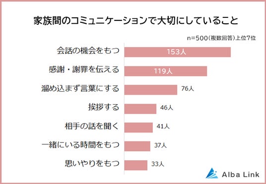 株式会社AlbaLink(本社:東京都江東区、代表取締役:河田 憲二)は、家族と暮らしている500人を対象に「家族間のコミュニケーションに関する意識調査」を実施し、そのデータをランキングにしました。