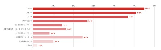 プロミスと同じ大手の消費者金融を比較対象としている人が多かった。プロミスでの借入を検討している人が、プロミスの審査のスピードや手続きの利便性などを他の消費者金融と比べていると考えられる。