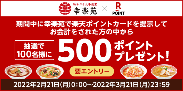 キャンペーン期間中にエントリーのうえ、幸楽苑で「楽天ポイントカード」をを提示して100円(税抜)以上の会計をされた方の中から抽選で100名様に500ポイントを進呈します。