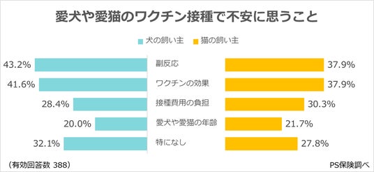 ・愛犬や愛猫のワクチン接種で不安に思うことは、「副反応」(犬43.2%、猫37.9%)と「ワクチンの効果」(犬41.6%、猫37.9%)が上位を占める。