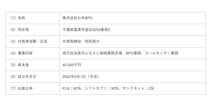 株式会社フューチャーリンクネットワーク(本社:千葉県船橋市、代表取締役:石井丈晴、以下FLN)と株式会社シフトセブンコンサルティング(本社:福岡県福岡市中央区、代表取締役:井本憲史、以下シフトセブン)および株式会社サンクネット(本社:大阪府大阪市淀川区、代表取締役:片町吉男、以下サンクネット)との共同出資により、地方自治体のふるさと納税におけるBPO(ビジネスプロセスアウトソーシング)やコールセンター等の業務支援にイノベーションを起こし、地域活性化のさらなる加速を目的とした「株式会社公共BPO」の設立に関する合弁契約の締結を決議し、2022年9月1日に設立することとしましたので、下記の通りお知らせいたします。