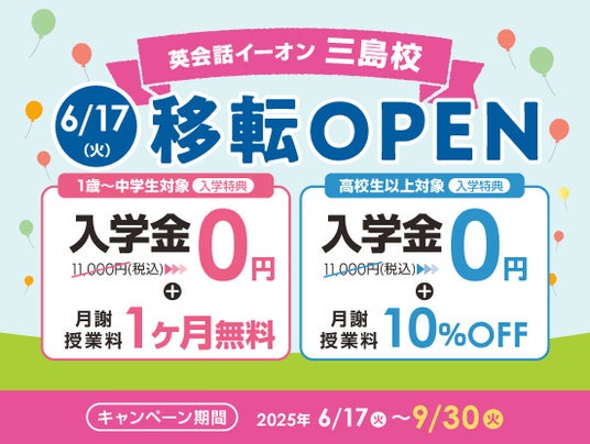 英会話教室を運営する株式会社イーオン(本社:東京都新宿区、代表取締役社長:重野卓、以下「イーオン」)は、2025年6月17日に現在の「イーオン沼津校」を移転し「イーオン三島校」としてオープンいたします。