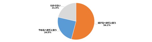 イラン情勢を受けた原油価格高騰への対応として、政府はガソリンの全国平均小売価格を1リットル当たり170円程度に抑えるための補助金を支給している。家計や企業などの負担軽減となる一方、イラン情勢の長期化が懸念される中で、需要抑制や財政負担の観点から、補助金支給をやめるべきだとの意見もある。ガソリンなど燃料油への補助金支給は「続けるべきだと思う」が54.1%を占めたのに対し、「やめるべきだと思う」は24.5%だった。「わからない」が21.4%あった。