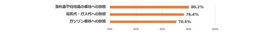 イラン情勢を受け、日常生活で気にしていることを複数回答で聞くと、「食料品や日用品の価格への影響」が80.2%で最も多く、「電気代・ガス代への影響」76.4%、「ガソリン価格への影響」70.6%と続いた。