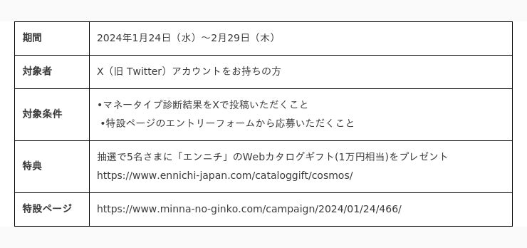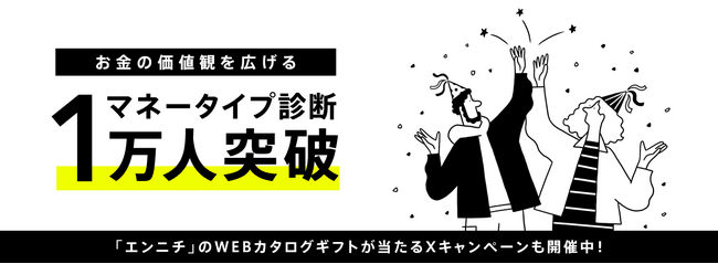 マネータイプ診断実施者数1万人突破を記念して、『教えて! マネータイプ診断結果をXで投稿しよう』キャンペーンを実施します。診断結果をX(旧 Twitter)で投稿&エントリーフォームから応募いただいた方の中から、抽選で5名さまに「エンニチ」のWebカタログギフトをプレゼントします。