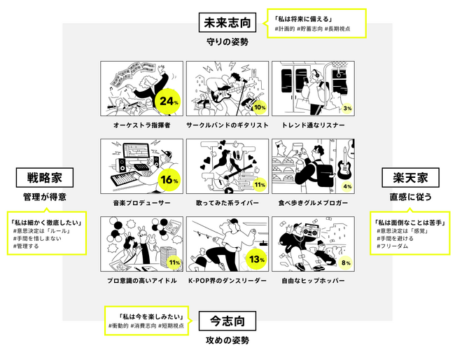 最も多かったマネータイプは、オーケストラ指揮者「全体を俯瞰して個々に役割を与える未来志向タイプ」(24%)でした。次いで、音楽プロデューサー「細かな調整で確実に物事を進める戦略家タイプ」 (16%) 、K-POP界のダンスリーダー「型にははまらず新しいものを取り入れる今志向タイプ」 (13%)が続きます。