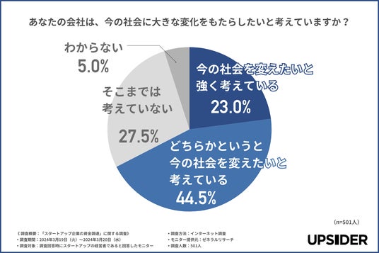 最後に本調査では、スタートアップの経営者が社会に変化をもたらしたいと思っているかどうかについても尋ねました。その結果、「今の社会を変えたいと強く考えている」と「どちらかというと今の社会を変えたいと考えている」の回答割合を合計すると、全体の7割弱である67.5%に及びました。