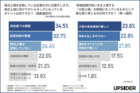 続いて、時価総額が低いまま上場する「小粒上場(小粒IPO)」の原因について尋ねたところ、「大型の資金調達が難しい(23.6%)」と回答した方が最も多く、次いで「資金の出し手が少ない(22.8%)」「適切なタイミングの見極めが難しい(21.8%)」と続きました。*3
