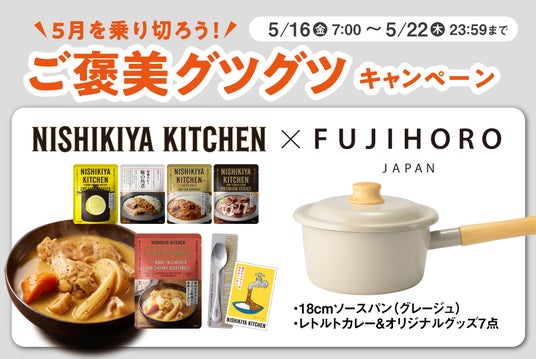 「世界の料理を『カンタン』に。」をコンセプトに掲げ、レトルトカレーを中心に約120種類のレトルト食品を販売するNISHIKIYA KITCHEN(ニシキヤキッチン)(株式会社にしき食品 本社:宮城県岩沼市、代表取締役社長:菊池洋一)は、2025年5月16日(金)より、ホーロー素材を使ったキッチンウェアの国内最大メーカー、富士ホーロー(富士琺瑯工業株式会社 本社:東京都台東区柳橋、代表取締役社長:兼平 実)と初めてコラボレーションし、ニシキヤキッチン公式X(@nishikiya・フォロワー数3.6万人※)および富士ホーロー公式X(@fujihoro_japan・フォロワー数17.7万人※)でプレゼントキャンペーンを開催します。ゴールデンウィーク明けからなんとなく体が重い、やる気が出ないなどの“休みぼけ”に悩む時期に、食事から気分を整えるきっかけを届けたいという想いから「5月を乗り切ろう!ご褒美グツグツキャンペーン」を企画しました。ニシキヤキッチンの人気レトルト食品やオリジナルグッズをはじめ、おしゃれで機能的な富士ホーローの18cmソースパン(片手鍋)が入った、コラボキャンペーン限定の豪華なセットを抽選で3名様にプレゼントします。