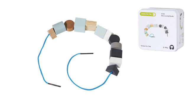 特徴:缶が可愛い、知育おもちゃがシリーズ展開!ひも通しは、様々な形と色のブロックをひもに通す遊びだよ♪指先の使い方や、感覚の発達を促すことができ、遊びながら楽しく学べる!キミは何秒で全部のブロックを通せるかな!?