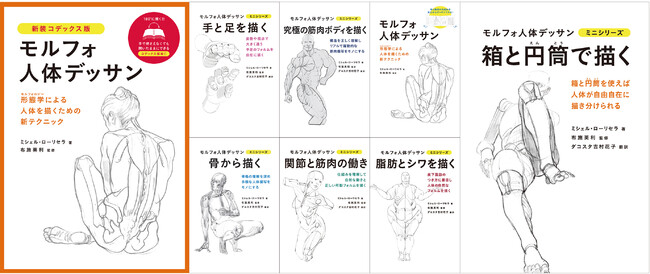 モルフォ人体デッサンの基礎を記した1作目の『モルフォ人体デッサン』、模写しやすいコデックス装を採用した『モルフォ人体デッサン 新装コデックス版』(1作目と同内容)は合計発行部数8.5万部を超え、シリーズ8作目の累計で31万部を突破した、模写できるデッサン集の大定番とも言える人気シリーズです。