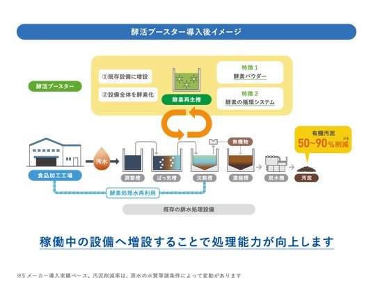 「酵活ブースター」を導入することで排出される汚泥を大幅削減するだけでなく、薬剤使用量の削減、臭気の削減を実現します。また処理水は酵素を含む水として消臭効果等があるため、工場内清掃などに再利用いただけます。
