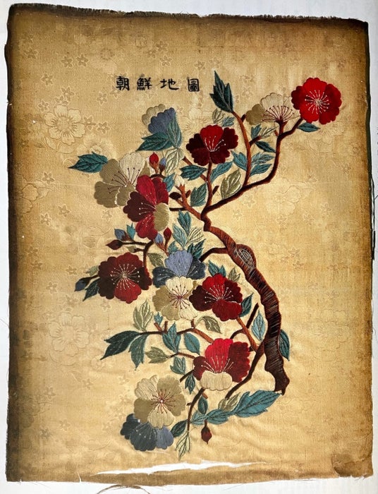 李相祚(イ・サンジョ)さんの実家(三重県桑名市)の居間にずっと飾ってあった槿の刺繍。あふれんばかりに咲いた槿の花を絹布に刺繍し、朝鮮半島を描いている。(写真:『暮しの手帖』第4世紀16号より、本書2ページ掲載)