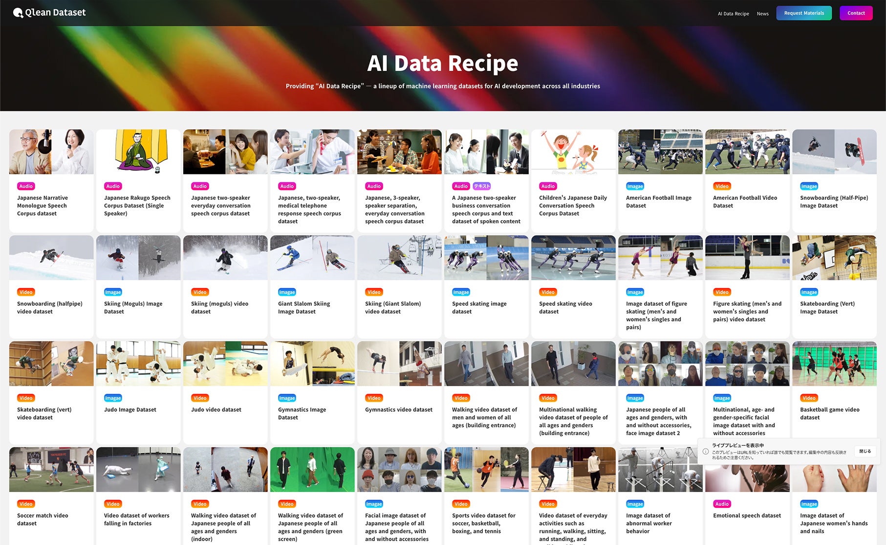 画像・動画・音声・3D・テキストなど、多様な形式のデータに対応し、研究・商用いずれの用途でも安全に利用できる環境を整備しています。また、国内・海外のデータホルダーやラジオ・新聞社・通信社等のメディアとの協業を通じ、業界特化・最新トレンドに即したデータラインナップ『AIデータレシピ』を継続的に拡充しています。