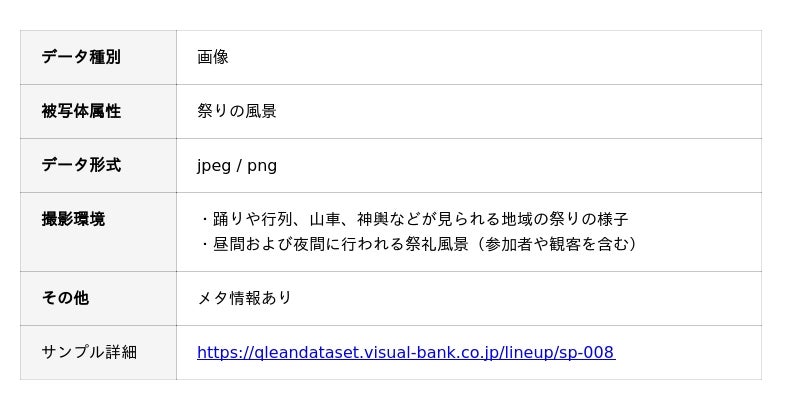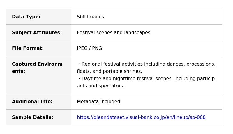 Visual Bank Co., Ltd. (Headquarters: Minato-ku, Tokyo; Representative Director and CEO: Saneyuki Nagai) is pleased to announce the release of the "Japanese Regional Festival Image Dataset." This new offering is part of "Qlean Dataset," an AI training data solution provided through its subsidiary, amanaimages inc. The dataset is optimized for training Computer Vision (CV) models in areas such as object recognition and scene understanding, as well as for research into Multimodal AI capable of contextual image interpretation.