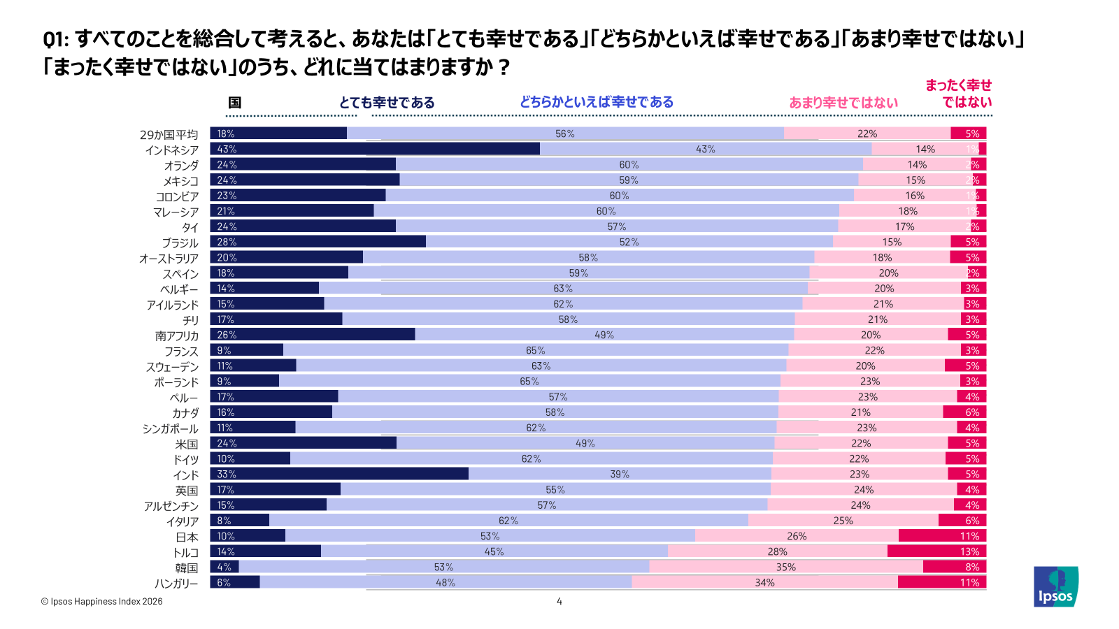 29か国全体の平均では、74%が「幸せである」、26%が「不幸せである」と回答しました(
