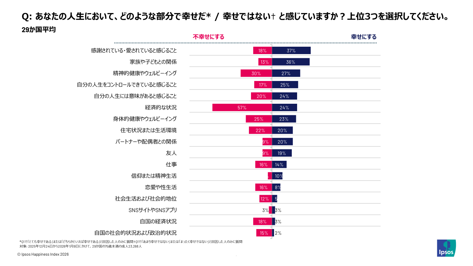 一方で、不幸を感じる要因は外部環境にあり、29か国中28か国で「自身の経済状況(57%)」が不幸の最大要因としてトップに挙げられました。