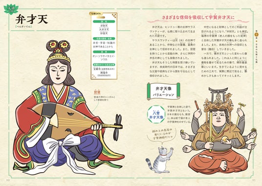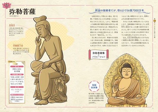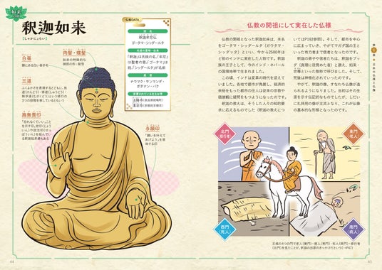 仏さまには、如来、菩薩、明王、天部といった位があり、さらに、釈迦如来、阿弥陀如来、薬師如来といったように、種類があります。それぞれの仏さまの形や由来、役割などをイラストでわかりやすく解説しています。
