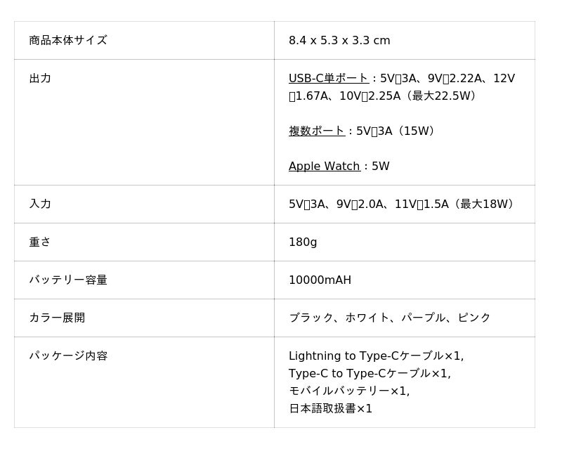 さらに、10000mAhの大容量バッテリーで、外出先や旅行でも安心して使用可能です。USB-CおよびLightningケーブル2本を編み込み式で同梱しており、ストラップとして持ち運べる便利なデザインも魅力です。