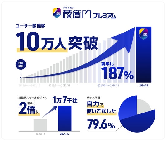 『蔵衛門プレミアム』の強みである直感的な操作性により、スモールビジネスへの導入が前年比で210%となる17,000社に拡大しました。その結果、ユーザー数も前年比187%と成長し、10万人を突破しました。導入後のユーザーアンケート(※2)では、79.6%のユーザーが、情報システム部門なしで導入でき、サポートがなくても自力で使いこなせたと回答しました。