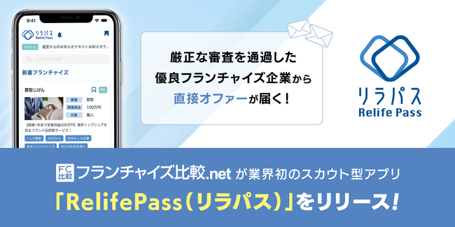 この度「フランチャイズ比較.net」は、厳正な審査を通過した優良フランチャイズ企業からオファーが届く、業界初のスカウトアプリ「RelifePass(リラパス)」を新たにリリースいたしました。