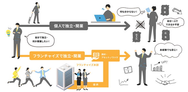 個人で店舗開業をする場合、仕入れ・接客・広告など、経営にまつわる様々な業務を全てオーナー自身で行うため、独立のノウハウを一から学んだり、商品・商材を生み出し開業したりするまでに膨大な時間と労力を要します。一方フランチャイズや代理店、業務委託などを通しての開業は、経営にまつわる様々なアセットや商材があらかじめ用意されている状態からのスタートとなります。本部からのノウハウの提供や経営指導を受けられることから、開業未経験の方でも低リスクではじめることができます。「経験がないから」と独立を諦めていた方でも挑戦できる、「未経験でも起業ができる」仕組みが特徴・魅力です。