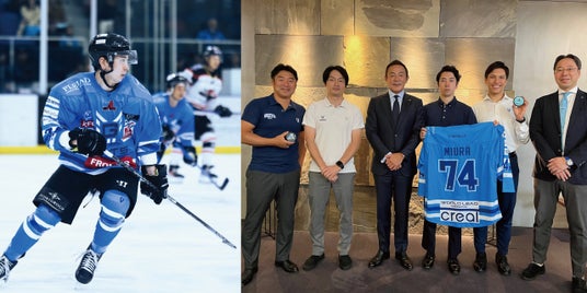 左:三浦大輝選手(GRITS スポーツイノベーターズ株式会社より提供)右:横浜GRITS監督 浅沼芳征、GRITSスポーツイノベーダ―ズ株式会社代表取締役 臼井亮人、リストグループ代表 北見尚之、リストホームズ株式会社 三浦大輝、横浜GRITS 鈴木ロイ、GRITSスポーツイノベーダ―ズ株式会社共同代表 御子柴高視(敬称略)