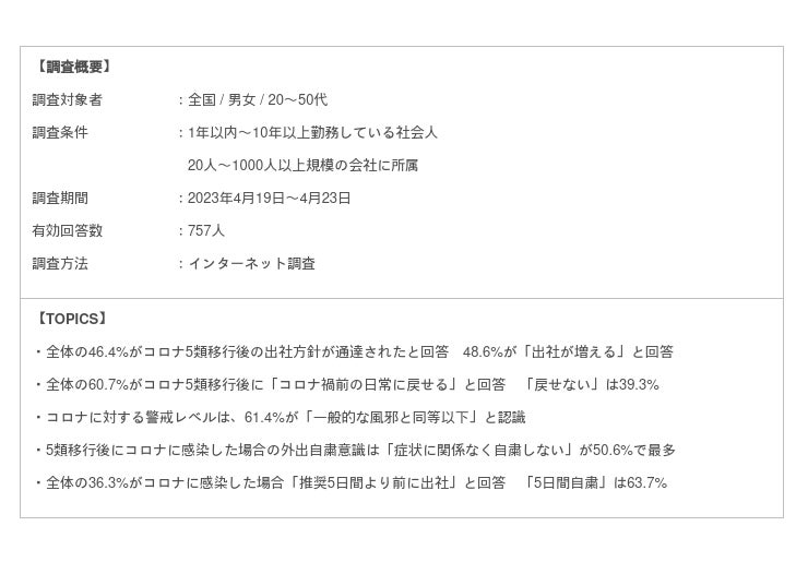3年以上続いたコロナ禍も5月8日から緩和され、インフルエンザと同等レベルの5類に移行しますが、それと同時に、会社組織でもそれに歩調を合わせた通達がされていることから、今後はさらに出社の方針やマスクの着用基準などにも変化が出てくることが推測できる調査になりました。