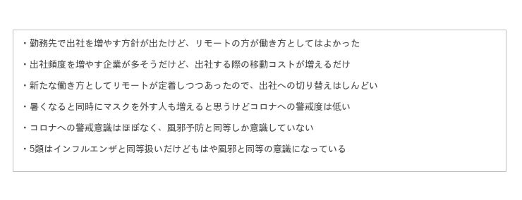 コロナ5類移行後の出社とコロナへの意識変化についてのコメントが顕著でした