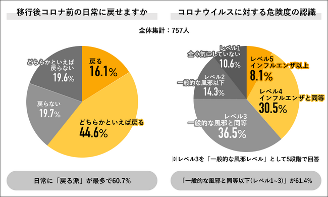 そこでJob総研では、5類移行後の出社増減や会社からの方針通達有無、またコロナ禍前の日常に戻れるか否か、現在の新型コロナに対する警戒意識や、自身が感染や濃厚接触した場合の自粛意識や出社有無などについて調査した「コロナ5類移行に伴う意識調査」を実施しました。
