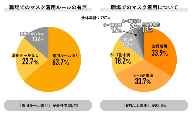 職場でのマスク着用ルール(簡易的なガイドラインの周知を含む)の有無を聞くと、「着用ルールあり」が63.7%で最多回答になり、次いで「着用ルールなし」が22.7%、「有無を知らない」が13.6%の回答結果になりました。また職場全体(従業員全体)のマスク着用率については、「全員着用している」が33.9%で最多回答になり、次いで「8~9割未満が着用している」が33.7%、「6~7割未満が着用している」が18.2%、「半数が着用している」が8.2%、「半数以下」の回答は6.0%でした。