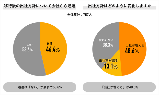 5類移行後の出社方針について会社からの通達があるかを聞くと、「通達あり」が46.4%で「通達なし」が53.6%でした。また出社の増減では「出社が増える」が48.6%で最多回答になり、次いで「変わらない」が38.3%、「出社が減る」が13.1%の回答結果になりました。
